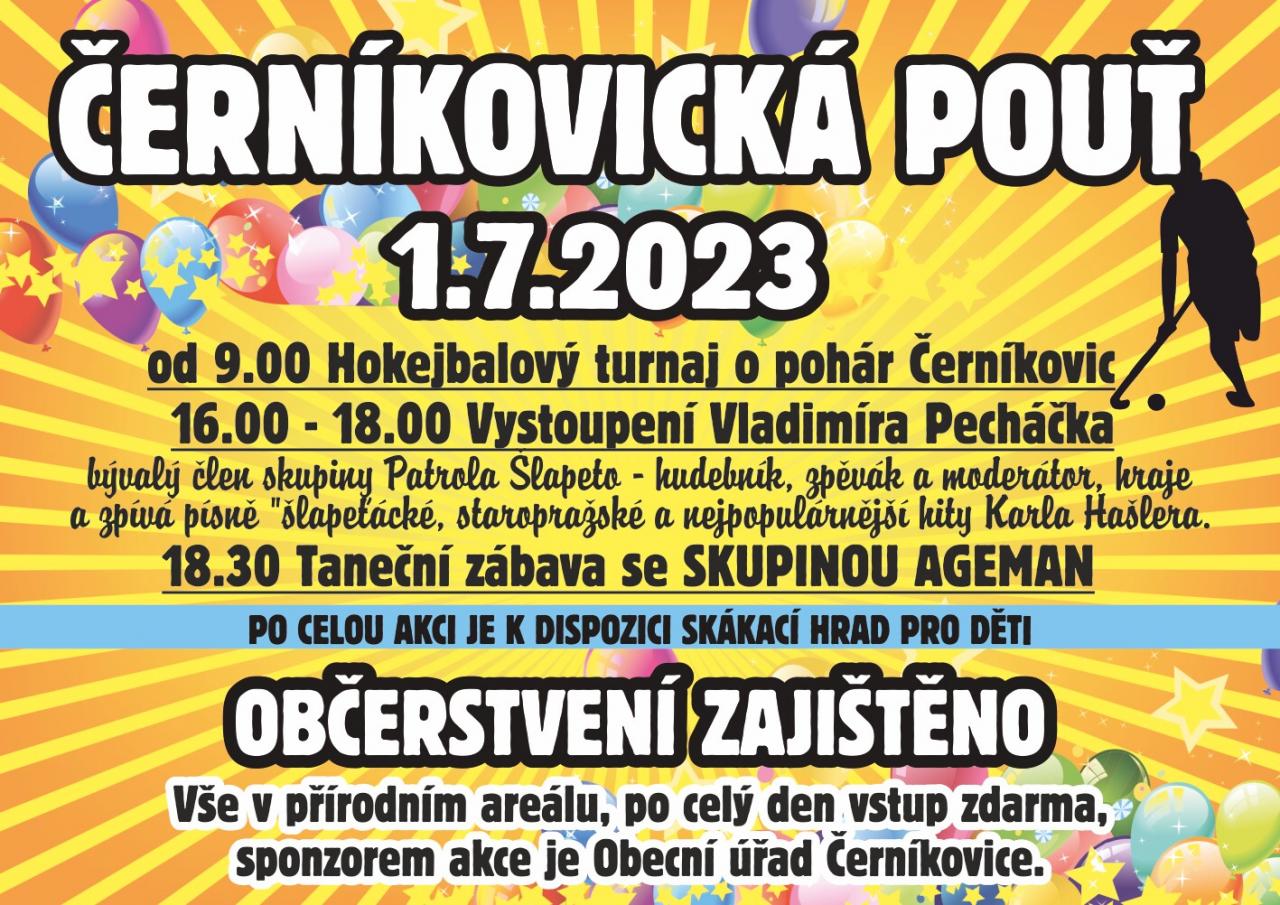 Černíkovická pouť 1. července 2023 proběhne v přírodním areálu, kde program začíná v 9 hodin ráno hokejbalovým turnajem. Od 16 hodin bude publikum bavit vystoupení Vladimíra Pecháčka a jeho staropražských písniček. V 18:30 hodin začíná Taneční zábava se skupinou Ageman. Po celý den se mohou děti bavit na skákacím hradě.